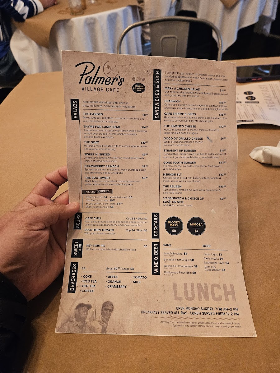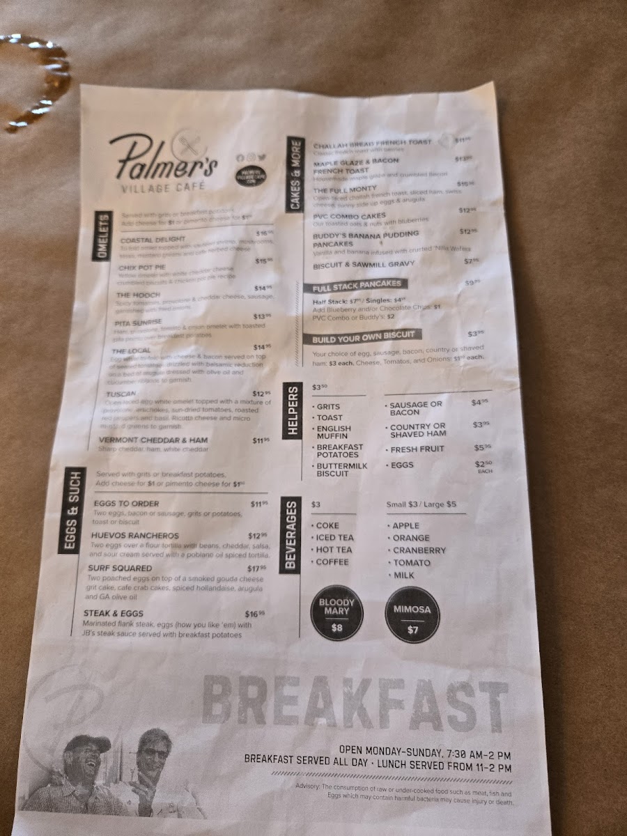 When you step into Palmer's Village Cafe, located at 223 Mallery St on St. Simons Island, you’re in for a treat. The menu offers a variety of dishes that truly highlight the best of Southern comfort food. From savory breakfast options like their mouth-watering omelets and fluffy pancakes to hearty lunches that include fresh salads and delicious seafood, there’s something for everyone. Don’t miss out on their signature dishes, which are loved by regulars and newcomers alike. Whether you're craving a classic BLT, a perfectly grilled burger, or a bowl of creamy shrimp and grits, the Palmer's Village Cafe Menu has all the flavors to make your meal special. The friendly atmosphere combined with the variety of delicious options makes it the perfect spot to relax and enjoy a great meal with friends or family.